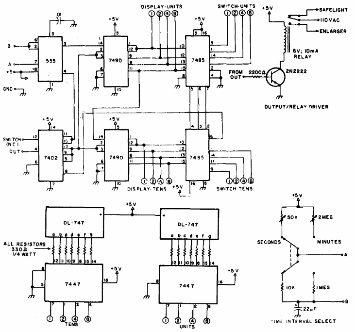This TTL circuit with a two-digit display provides intervals of up to 99 minutes, programmed in thumbwhell switches. The circuit is from a 1977 technical documentation, and must be powered with 6 V. For the relay, we can use 6 V types, changing the power only in this step. The circuit can operate in conjunction with microcontrollers as a shield.