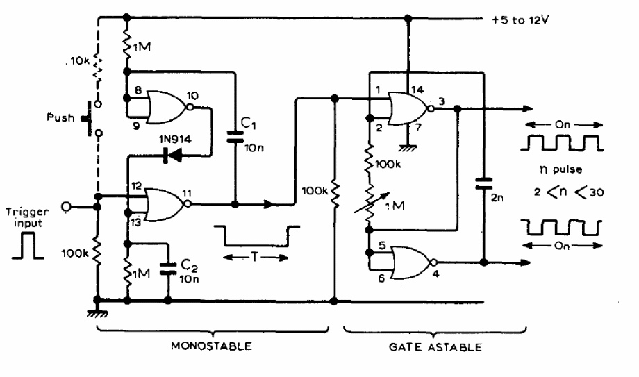 We found this circuit in a 1977 documentation. The integrated circuit used is 4001. The signals generated depend on the 2 nF (2n2) capacitor and the potentiometer setting. The circuit can be used in a shield for microcontrollers.