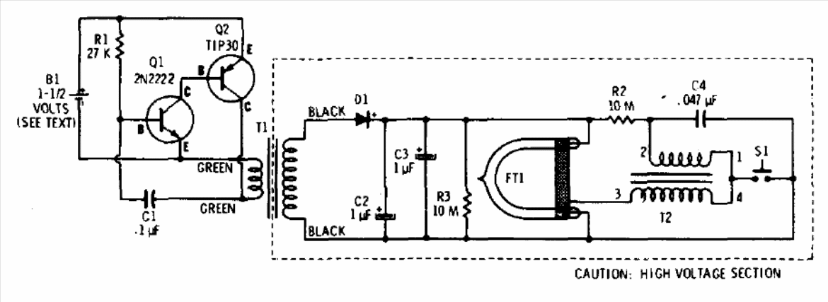 We found this circuit in a publication by Radio Shack in 1975. The pulse transformer has a low voltage winding with 100 turns and a high voltage with 1000 turns in a small ferrite rod. The wire can be 32. The inverter transformer can be a small 6 V x 300 mA transformer with a 220 V primary.