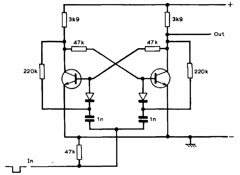 This flip-flop was found in an old documentation, being able to use transistors of general use like BC548 and general-purpose diodes like 1N4148. The supply can be done with voltages from 9 to 12 V. Note that the circuit trips with the negative transition of the input signal.