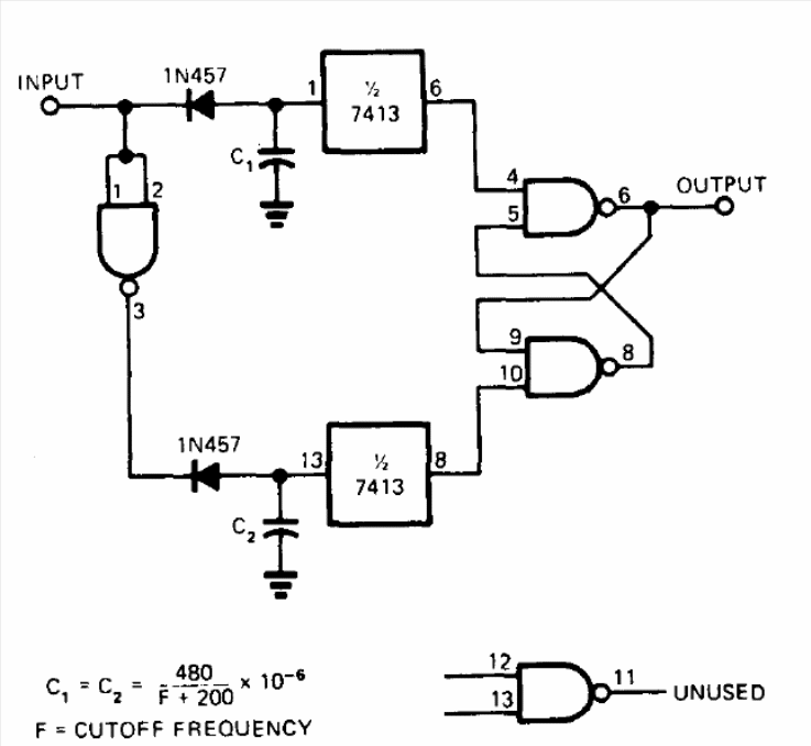 This circuit was obtained in a 1973 publication, being implemented with TTL technology. The circuit lets pulses pass below the frequency determined by the formula next to the diagram. The supply must be 5 V.