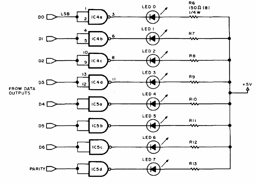 This circuit was found in a 1977 documentation. With it we have the direct indication, through LEDs of an ASCII signal. The circuit must be powered by a voltage of 5 V.