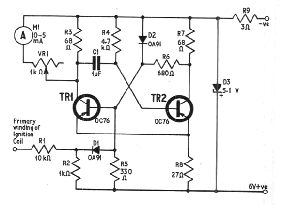 This circuit, which uses germanium transistors, is from a 1965 English magazine. The used transistors are very difficult to obtain, but the circuit can be adapted to use PNP silicon transistors like the BC558. The instrument can also be 1 mA with an increase from VR1 to 10k ohms. The diodes are made of germanium. Components can be changed for 12 V operation.