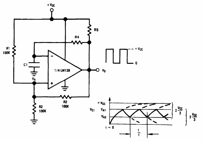 We found this circuit in the Linear Applications Handbook by National Semiconductor. The circuit uses one of the LM139's four comparators and does not need a symmetrical source. The frequency depends on R4, R5 and the capacitor.