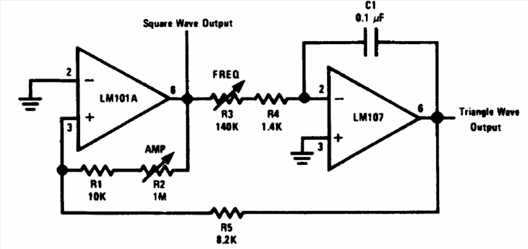 The circuit is from the National Semiconductor Linear Applications Handbook published in 1994. The signals are triangular and square, and the power source must be symmetrical. The circuit can be implemented with modern operational amplifiers and components with standardized values replaced by current ones with more common values.