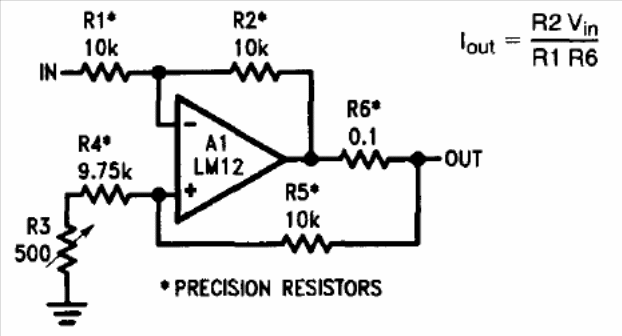 The LM12 integrated circuit can provide a maximum current of 4 A with a symmetrical supply of 40 V. In the figure we have a voltage-to-current converter with the component values calculated by the formula next to the diagram. The circuit is from National Semiconductor's Linear Applications Handbook.