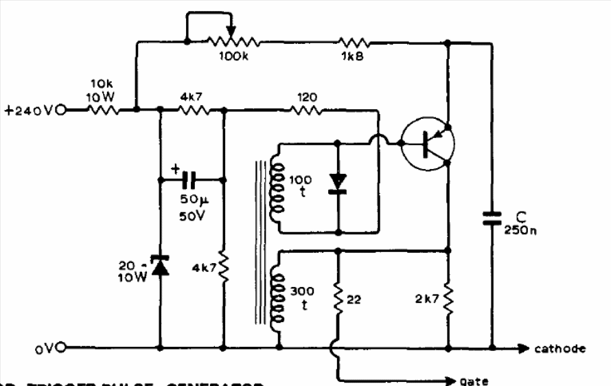 This circuit generates pulses to trigger power controls with SCRs and Triacs. We found it in a 1974 technical documentation. The transistor can be a BD136 and the transformer is wrapped in a ferrite core with 30 or 32 wire. The zener diode is 20 V.