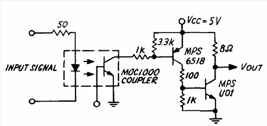 This pulse amplifier with optical isolator is from a Motorola manual from 1973. The transistors can be equivalent as the BC548 and BC558 and the optical isolator almost any type that uses a phototransistor. The circuit has an output compatible with TTL logic and can be used as a shield for microcontrollers.