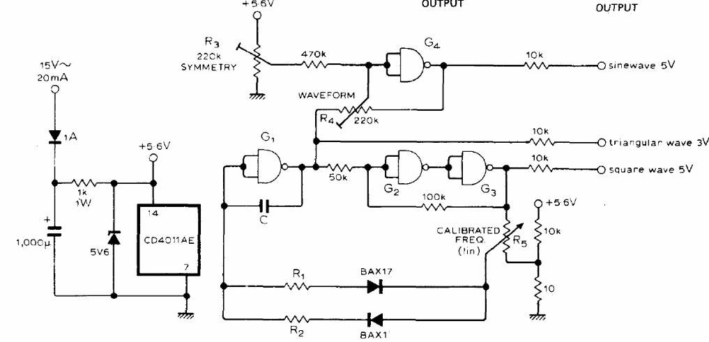 This circuit was found in an English technical documentation from 1976. The supply can be done with voltages of 5.6 and 15 V and the maximum frequency is in the order of a few megahertz. The diodes admit equivalents.