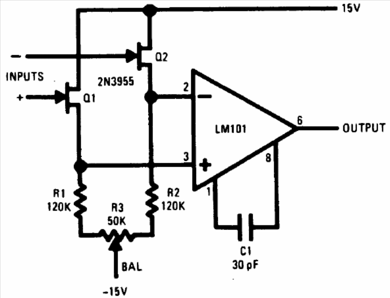 In the figure we have the way to obtain an operational amplifier with FETs at the input, using a common operational one that can be of a more modern type. The circuit is from National Semiconductor's Linear Applications Handbook. The FETs can be the BF245.