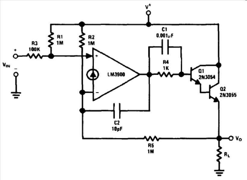 The circuit shows how to implement a power stage for the LM3900 transconductance operational amplifier. The circuit is suggested by the National Semiconductor Linear Applications Handbook. Q1 can be a BD135.