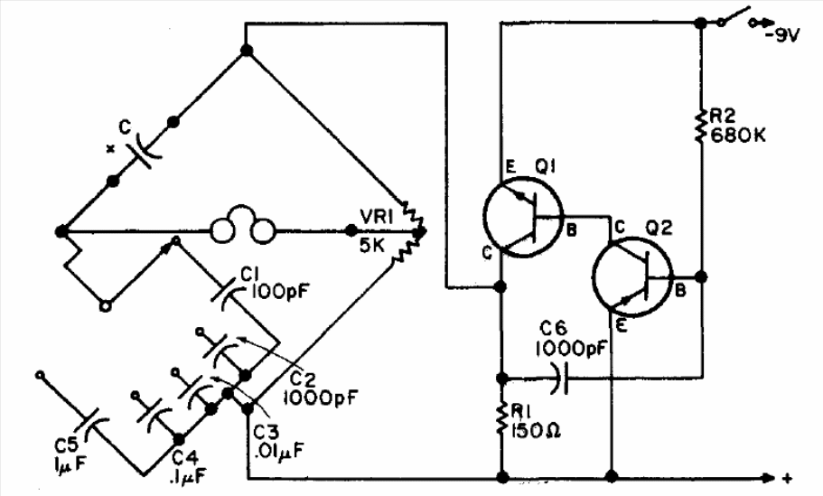 With this circuit, from an American documentation from 1976, it is possible to measure capacitances from 25 pF to 10 uF. The circuit consists of an oscillator with a Wheatstone bridge that has a headset as null detector. The handset can be piezoelectric or even of another type. VR1 can be 4k7. Q1 can be a BC548 and Q2 a BC558.