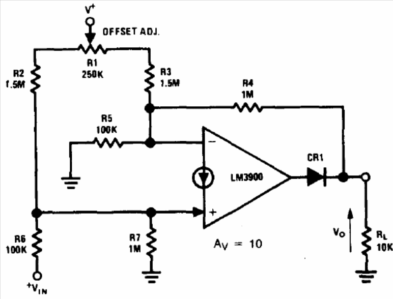 This circuit, with the LM3900 transconductance amplifier, has an adjustment to obtain zero output volt with zero input volt, compensating for the offset. The circuit is suggested by National Semiconductor in its Linear Applications Handbook.