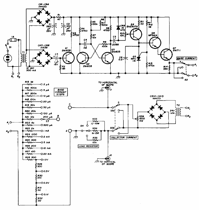 We found this circuit in a publication for radio amateurs in 1977. The circuit allows the characteristic curve of a component to be projected on the screen of an oscilloscope. Transistors can be general purpose types like BC548.