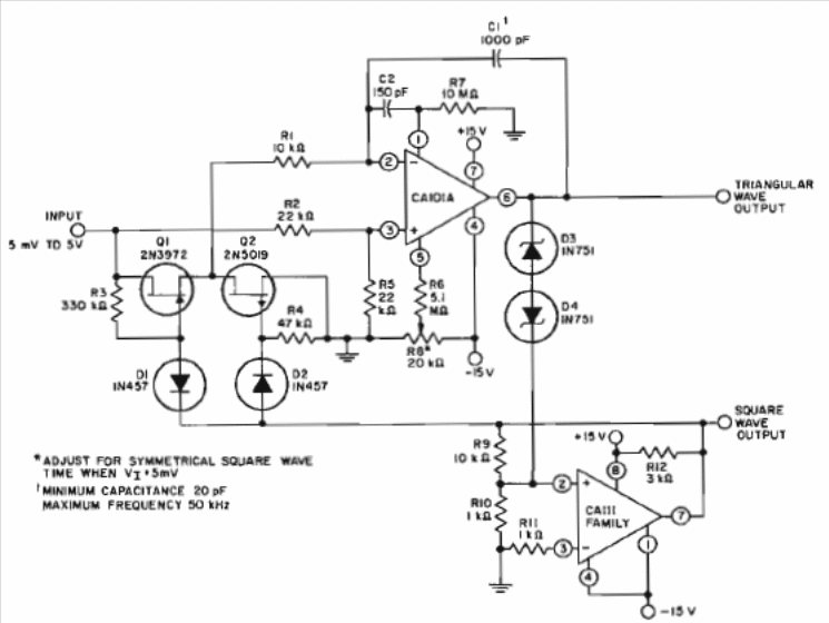 This VCO circuit was obtained in the 1972 RCA linear circuits manual. The integrated comparator is CMOS and more modern types can be used, as well as the FETs that must be complementary. The output signal is triangular with amplitude determined by the zener diodes. The power supply must be symmetrical.