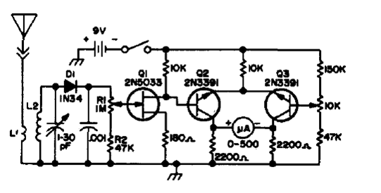 This instrument was found in a publication for radio amateurs in 1973. The tuned circuit consists of 11 turns of wire 28 in the form of 1 cm without core for the range of 13 to 24 MHz. L1 consists of 5 turns of the same wire over L2. The variable is from an ordinary AM radio. The FET can be the BF245 and the other BC548 transistors. The antenna is telescopic from 60 to 100 cm.