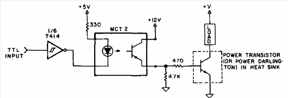 With an optical coupler and a power transistor, which can be the BD135, it is possible to control loads up to 500 mA from TTL pulses. The circuit has a sector powered by 5 V (TTL) and a stage of power per voltage that depends on the load. The circuit can be used as a shield for microcontrollers.