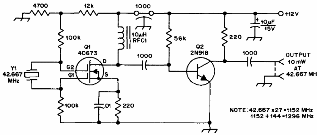 This unusual circuit, from a documentation for radio amateurs from the 70s, can oscillate in other frequencies, depending only on the crystal used. The transistor can be the BF494 and any double port MOSFET can be used. The frequency limit is in the order of a few tens of megahertz depending on the transistors.