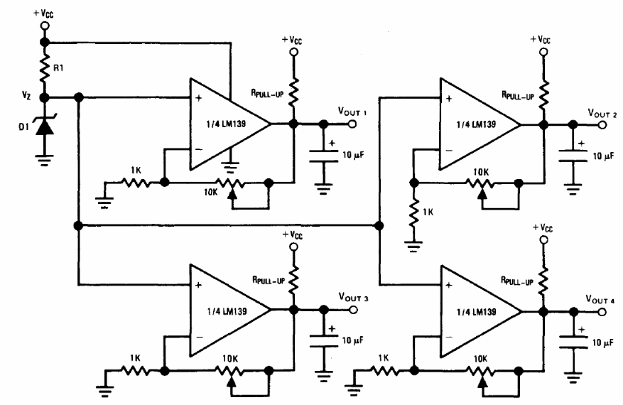 The circuit shown below provides four adjustable reference voltages. Each of them is produced by a comparator of the four existing in the LM139. The circuit does not need a symmetrical source. We found this setting in the National Semiconductor Linear Applications Handbook published in 1994.