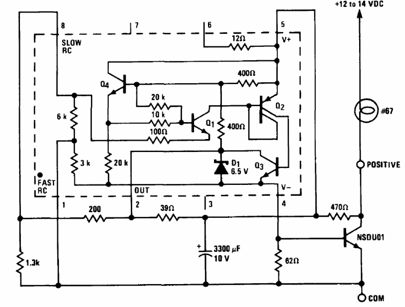 The selected circuit causes a 12 V lamp with a current of up to 500 mA for the BD135 transistor to flash at a frequency determined by the external capacitor. The circuit is suggested by National Semiconductor in a technical documentation.