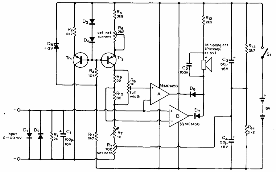 This circuit was obtained in an old documentation for radio amateurs. The circuit is a sound multimeter for the blind. The frequency of the sound produced in a small speaker or transducer depends on the input voltage in the range 0 to 100 mV. Resistive dividers can be added for measurements at other scales. The transistors can be the BC548 and the CI is nothing more than a double 741.