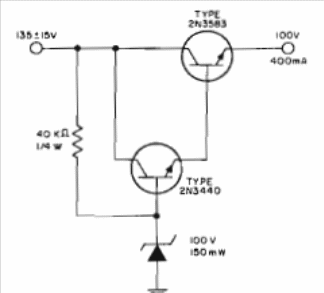 We found this circuit in the 1972 RCA power transistors manual. The transistors admit equivalents and must be equipped with good heat radiators. The circuit operates with a lower dissipation resistor and a smaller zener.