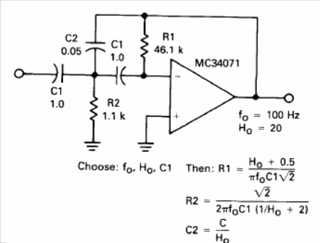 This configuration can be made based on other operational amplifiers. For other frequencies, the formulas are given next to the diagram. The circuit is from Motorola's 1990 Linear Databook. The power supply must be symmetrical.