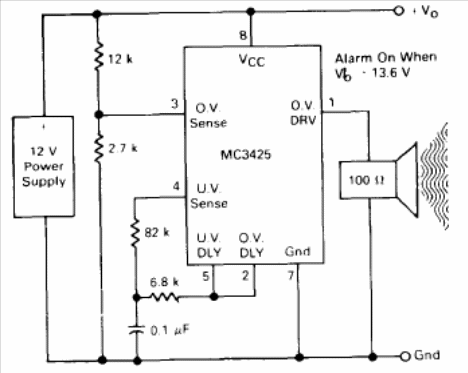 This circuit uses an unusual integrated today. It fires when the voltage exceeds 13.6 V in a source set to 12 V. The circuit is suggested by Motorola in its 1990 Linear Databook.