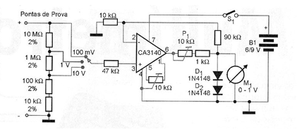The circuit of the figure allows to implement a multimeter of high sensitivity or even to use a common multimeter obtaining characteristics of high sensitivity. The selection of the bands is made by the switch and has funds of 100 mV, 1 V and 10 V. The full scale is determined by resistor R1 together with R6. This gain can be changed if the reader wishes to modify the instrument's scales. The indicator instrument is a voltmeter with 1 V full scale, or a multimeter adjusted for that scale. The circuit sensitivity is 1 M ohms / V. Power is provided by a 9 V battery and as consumption is extremely low, its durability will be long.