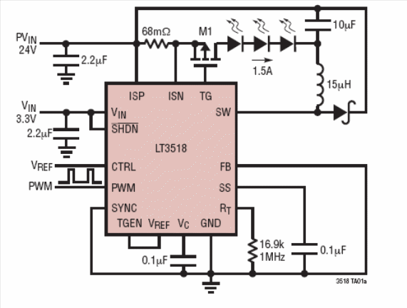 Linear Technology (www.linear.com) has in its component line the LT3518, recently launched, which consists of a driver for LEDs capable of supplying an output current of 2.3 A. In addition to already including an internal switch of 2 .3 V x 45 V, this component has a 3000: 1 PWM True Color intensity adjustment range, and a 100mV high-side current sensor. Other features of the integrated circuit are its adjustable switching frequency range between 250 kHz and 2.5 MHz and a protection against open LED. The operating voltage range is from 3 V to 30 V. The circuit can operate in boost, buck or buck-boost mode. The circuit also has protection against transients up to 40 V. In the figure we have the application circuit suggested by Linear, which can be used in background lighting, panels for automotive use, lighting, and scanners. The efficiency of the circuit exceeds 90%. More information about the LT3518, including different application circuits, can be obtained in the datasheet available in PDF format on the company's website.