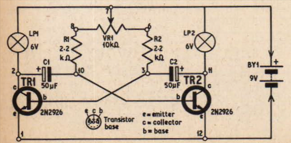 This lamp flasher configuration using an astable multivibrator is from a 1968 publication. The frequency depends on the capacitors, which can be 47 uF and instead of the lamps we can use LEDs in series with 470 ohms resistors. The transistors can be the BC548.