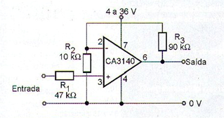 The voltage gain of the circuit shown in the figure is 10 times. This gain is given by the ratio (R2 + R3) / R2, which can be changed if the reader needs other characteristics for the circuit. Note that this circuit does not use a symmetric source.