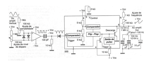 The circuit shown in the figure can be useful for readers who have an oscilloscope that does not have the ability to scan externally triggered by a signal to be observed. The signal applied to the input of the operational amplifier triggers the monostable, switching the internal flip-flop to the 555 and thereby cutting the discharge of the capacitor that is recharged. When the voltage in the capacitor reaches 1/3 of Vdc the circuit trips and the capacitor can discharge. This generates a sawtooth signal in the circuit for use at the oscilloscope's horizontal input. Linearity depends on the RC output circuit. This linearity can be significantly improved if the resistor R is replaced by a constant current source.
