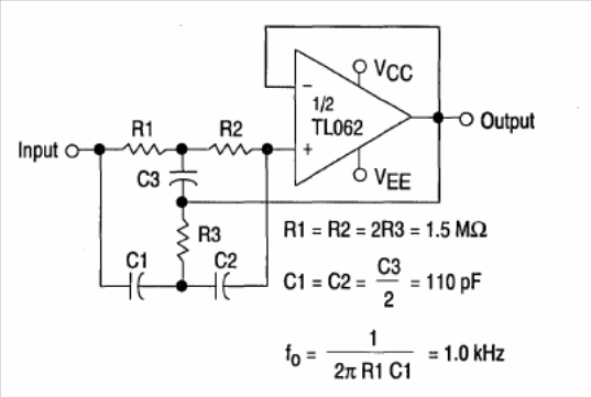 The circuit shown has the component values calculated for a frequency of 1 kHz. TL064 can also be used. We found this setting on Motorola's 1993 Linear Interface ICs. The font must be symmetrical.