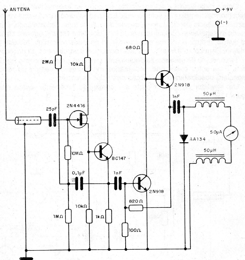 This sensitive field strength meter was found in 1993 documentation. The instrument may be the lowest current range of a standard multimeter. The FET can be the BF245 and the antenna is of the telescopic type.