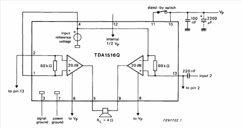 This circuit is from the 1990 Philips Databook. The circuit can be supplied with voltages up to 14.4 V and the load is 4 ohms for the indicated power. The integrated circuit must have a good heat radiator. The input resistance is 30k.