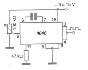 In the figure we show how to add a 100k ohms potentiometer to implement an oscillator controlled by this component. The frequency range generated can be obtained from the graph in the figure of CIR7974. The signal generated by this circuit is rectangular with amplitude equal to the voltage used in its supply.