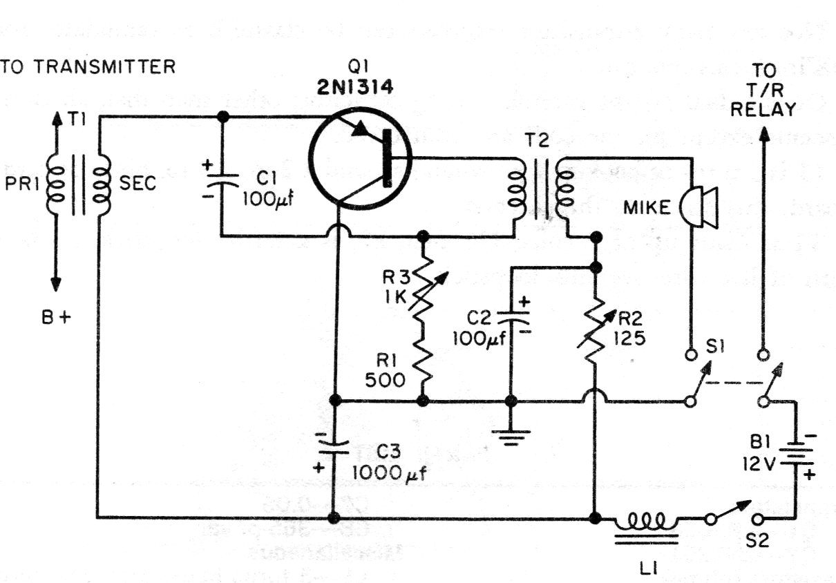 This circuit is designed to modulate small AM transmitters with the same power order. The circuit is from a 1964 publication. Transformers are the critical elements, and the transistor can be BD136 or TIP32. The microphone is of low impedance.