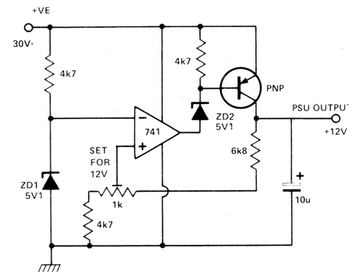 The maximum current of this circuit can reach 500 mA with BD136 and 1 A with TIP32. The circuit provides an output voltage of 12 V adjusted in the trimpot. This configuration was found in a 1978 documentation.