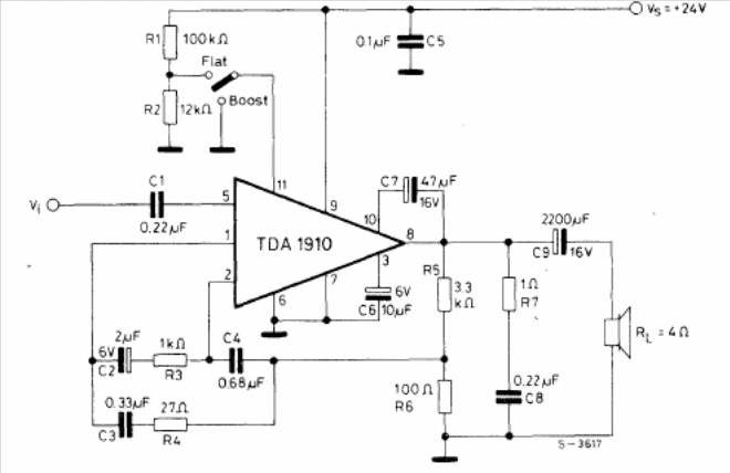 This circuit has two response curves that depend on the position of the tone control switch. The circuit is based on the TDA1910 which is not common today. The diagram is from the 1982 SGS Integrated Circuits Manual. The source current must be at least 1 A.