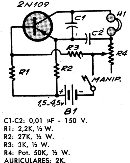 We found this circuit in an Argentine publication from 1973. The original transistor is made of germanium and the phone must be magnetic with an approximate impedance of 2k. Power is provided by 1 to 3 standard batteries connected in series. R4 adjusts the frequency.