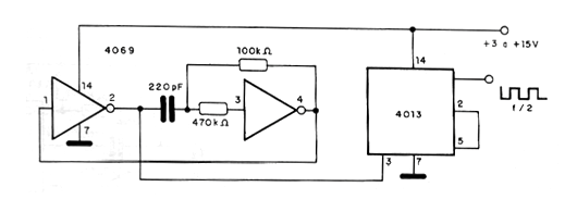 This circuit allows the division of the frequency generated by an oscillator with the 4069 by two, with an output signal maintaining an active cycle of 50%. This symmetry is important when the circuit is used in digital mixers, multiplexers, such as echo camera clock or digital delay lines. For the 4069 circuit only two of the 4 available gates are used, while for the 4013 only one of the flip-flops of this integrated are used in the circuit.