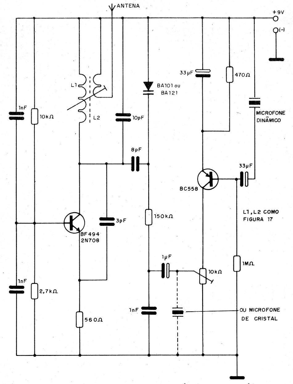 We found this circuit in a small espionage manual from 1993. The components are current, and the coils are easy to roll. L1 consists of 4 turns of wire 26 or 28 in the form of 1 cm without core and L2 plus 3 turns on L1. Tuning can be done by moving the core or by tightening and stretching the coil turns.
