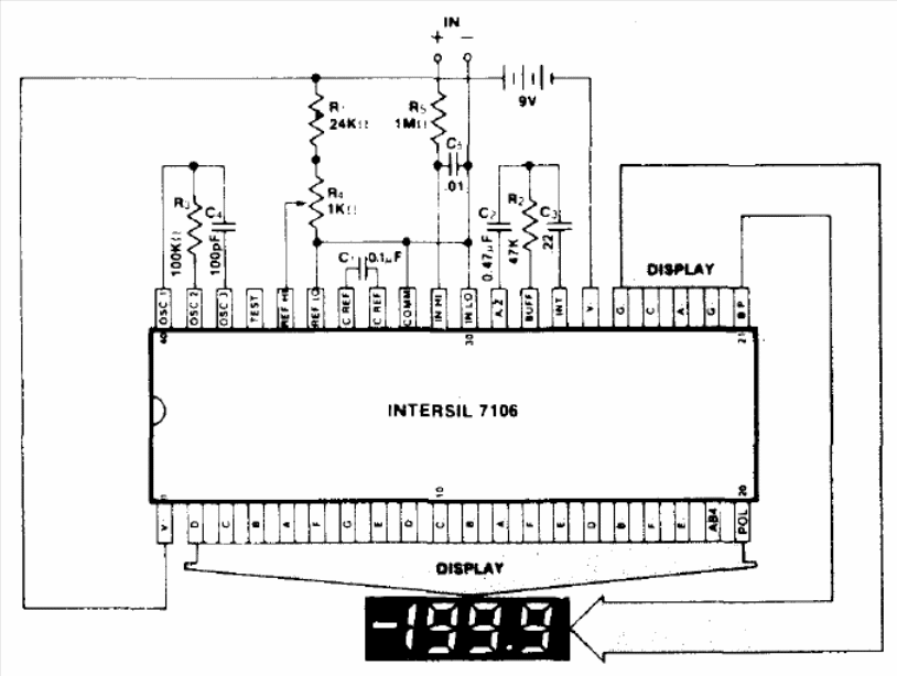 This circuit is from the 1983 Intersil Databook. This is a configuration that is still used today in low-cost multimeter and indicator instruments. The circuit is powered by 9 V and has a very low consumption. In this configuration is a basic voltmeter.