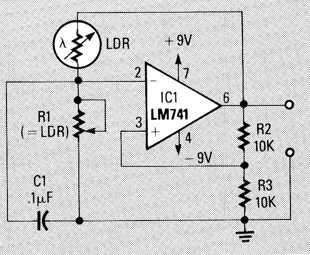 The sensor of this relaxation oscillator with a 741 is a common LDR. The supply must be symmetrical and potentiometer R1 must have approximately the resistance of the LDR at the trigger point. Other operational amplifiers can be used.