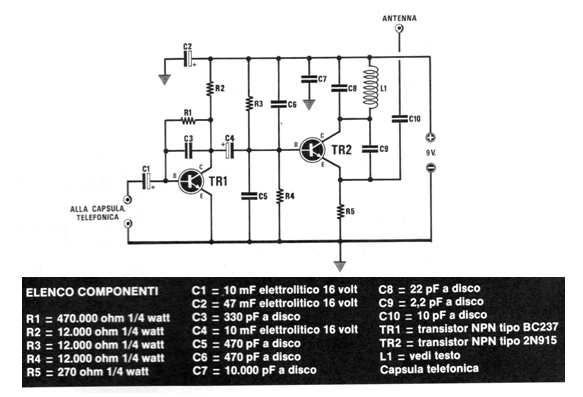 This small telephone transmitter uses a telephone capsule as a microphone. The L1 coil has 4 to 5 turns of wire 28 in the form of 1 cm. The supply can be made with voltages from 6 to 9 V and the range is a few tens of meters. Transistors support equivalents. The circuit is from a 1984 Nuova Elettronica