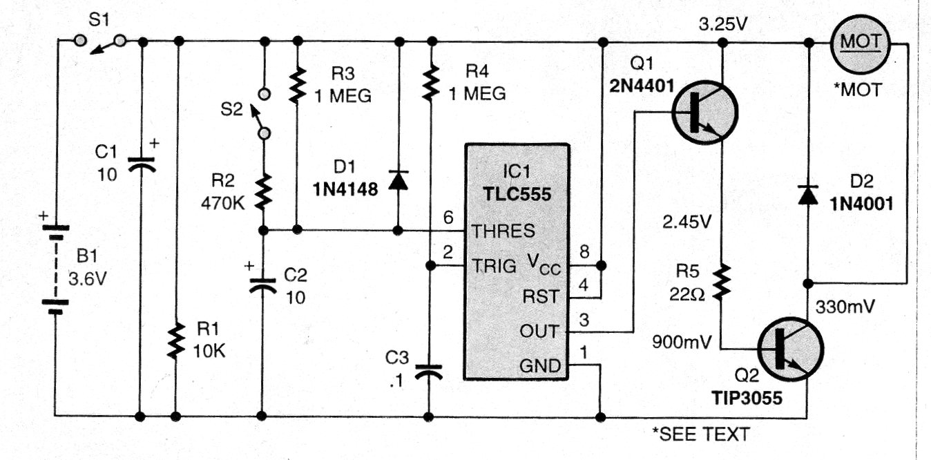 This circuit is indicated to determine the flight time of an electric motor model airplane. The circuit can also be used in other applications. Transistors support equivalents. We found this configuration in an American magazine from the 80s. For an application like the shield, remove S2 and apply the control signal (pulse) in S2.