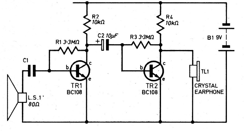 The transistors in this circuit can be the BC548 and a small speaker serves as a microphone. The earphone can be made of crystal or a ceramic capsule. The circuit can be used in an experimental intercom. We found the circuit in a 1978 documentation.