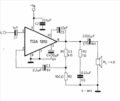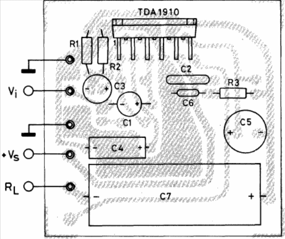With 8 to 30 V power supply, the output power depends on both the voltage and the load. The circuit is from the 1982 SGS linear integrated circuit manual. The integrated circuit used is uncommon today. The printed circuit board is given next to the diagram.
