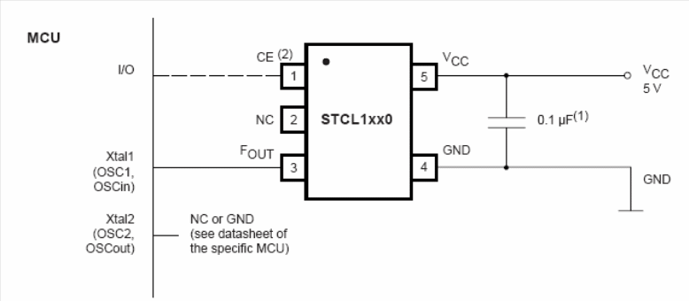 In the figure we have an oscillator for microcontrollers capable of operating in the frequencies of 10, 12 or 16 MHz, totally based on silicon. The oscillator is based on the integrated circuits STCL1100 (10 MHz), STCL1120 (12 MHz) and STCL1160 (16 MHz). The 1.5% precision circuit and operates at 5 V +/- 10%. The output is compatible with CMOS push-pull, with square signal. No external components are needed, and the housing is SOT23-5L. Fast and stable starting features are present in the component. The circuit is suggested by STMicroelectronics (www.st.com) and more information can be obtained in the datasheet.
